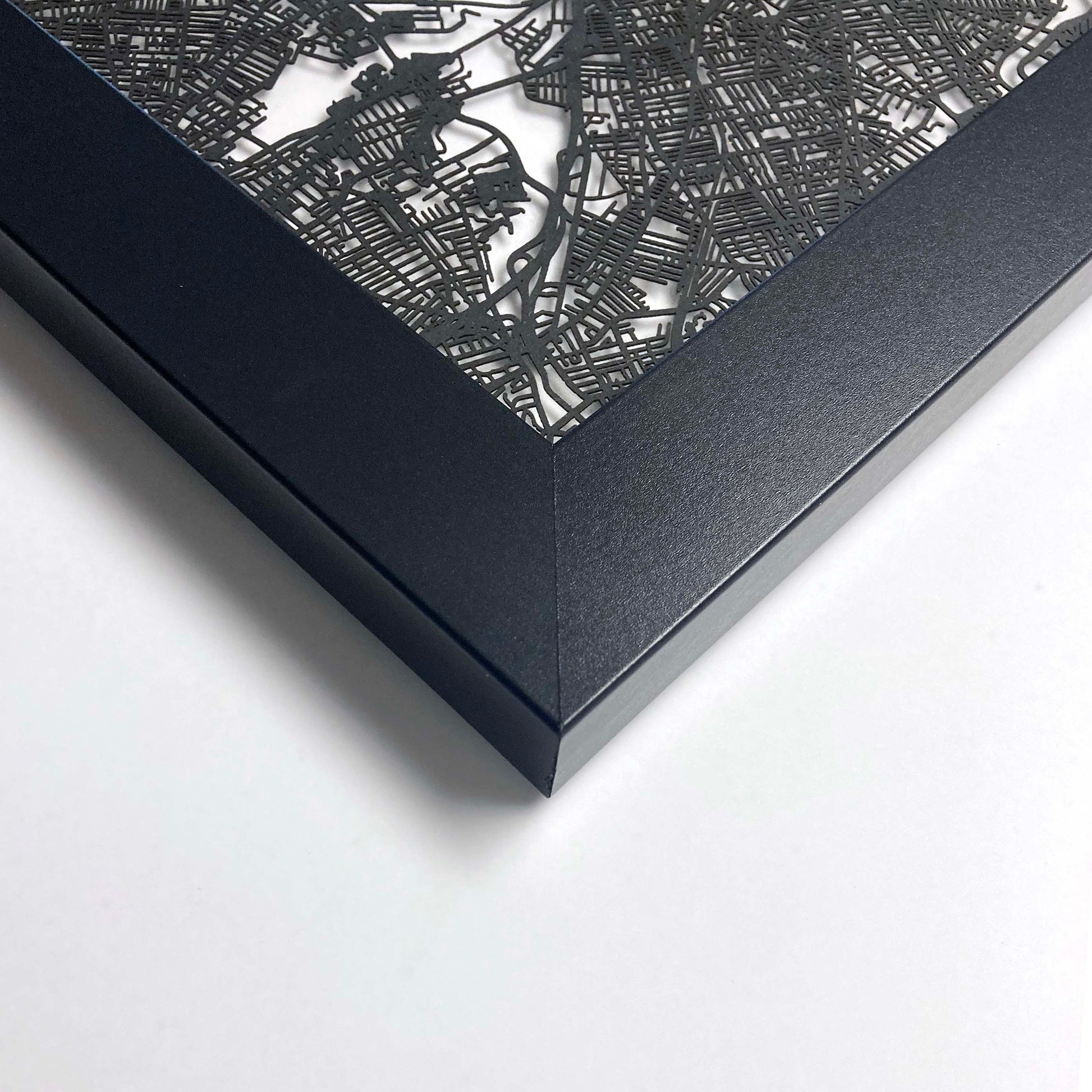 This laser cut map of Stockton, California comes ready to hang in a 1" black handmade wood frame. The laser cut streets of Stockton are layered between acrylic glass to create a 3D floating effect that will entice a closer look from any passerby. The map is cut from thick black cover paper and backed with archival white foamboard for a classic black and white look that will compliment any style.